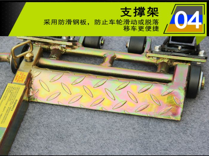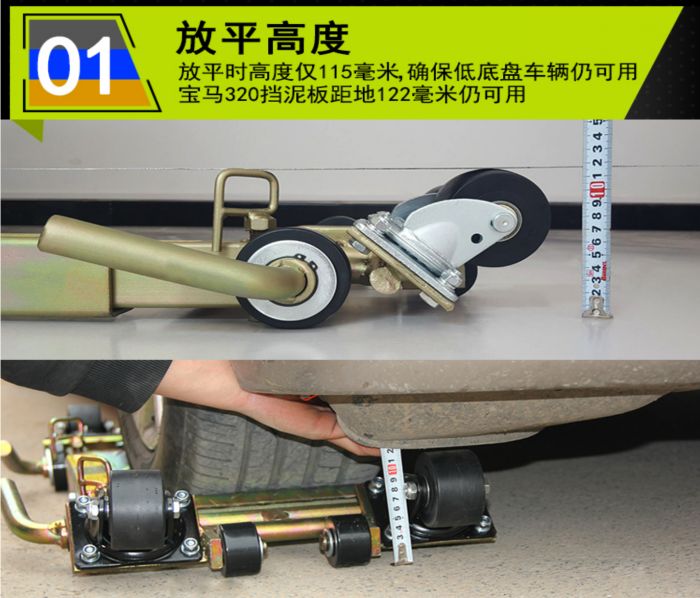 2、方便移车---移车器配有万向脚轮可使汽车任意方向移动;
