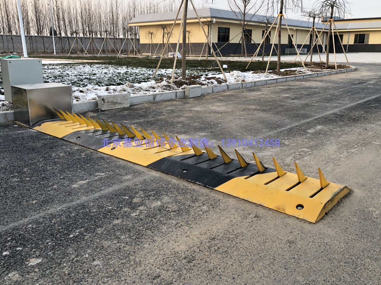 其结构由A3钢板及钢板刀片组成,采用机电一体遥控装置,破胎、阻车,是拦截机动车辆非法通行的先进装备。